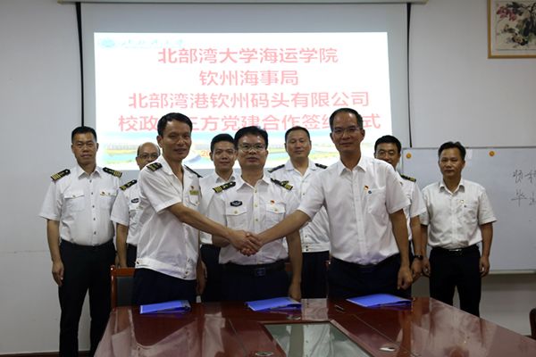 北部湾大学海运学院杜树营书记(中)、钦州海事局谭宗展副书记(左)、