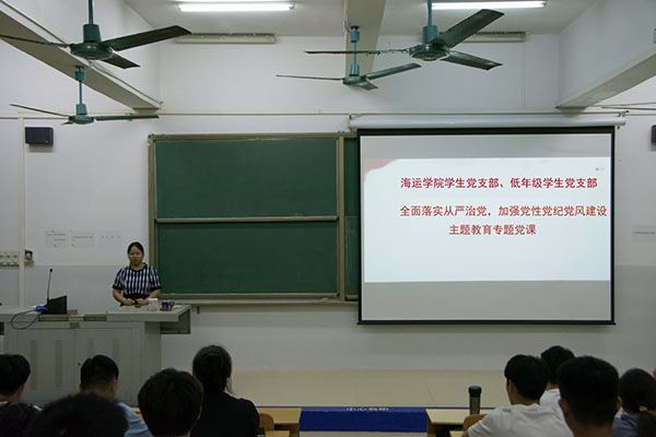 2023年6月11日晚上19:00在7B-215教室,海运学院学生党支部、低年级党支部开展题为“落实全面从严治党,加强党性党纪党风建设”主题教育专题党课暨党风党纪专题学习研讨会。会议由低年级学生党支部书记雷昌玲主讲,全体学生党员参加会议。