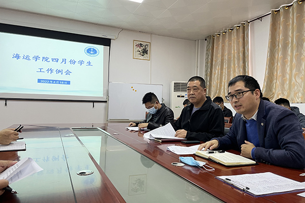 2022年4月18日,海运学院于7B219召开四月份全体学工人员例会。参会人员包括海运学院党委领导班子成员、各年级各班班主任、全体学工办老师。会议内容分为优秀班主任、专兼职辅导员表彰,以及进一步落实班主任管理办法两大议程。会议由董海亮副书记担任主持。