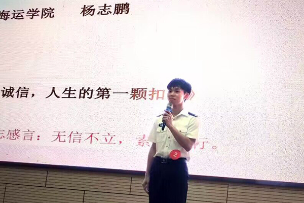 此次演讲比赛不同于以往的演讲比赛,时间紧任务重,短短一周时间内,既要完成院内初赛又要参加学校决赛,这对于选手来说是一次自我挑战。杨志鹏同学在老师的指导下完成了写稿改稿、提供制作PPT的素材、演讲培训等工作。杨志鹏同学在比赛中以《诚信,人生的第一颗扣子》为题进行演讲,沉稳热情、语言流畅、逻辑清晰,很好地呈现了海运学子的精神风貌,最终以91.60的评委评分在22名参赛者中脱颖而出,喜获佳绩!