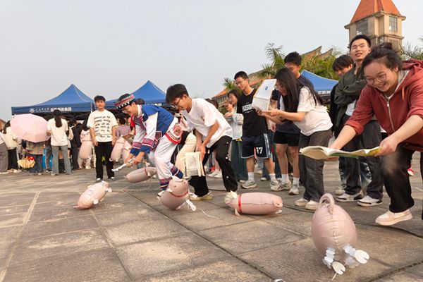 在各班级主题班会上,辅导员、班主任、同学们一同深入了解 “三月三”的历史渊源、传统习俗以及文化内涵。同学们积极分享自己对 “三月三”的认识与体验,讲述不同民族独特的庆祝方式。除了主题班会,学院还组织了别开生面的“赶野猪”趣味游戏。活动现场,同学们手持书本齐心协力赶着“野猪”(猪型气球)前进,欢笑声、加油声交织在一起,将活动气氛推向高潮。这项游戏不仅让同学们亲身体验到传统体育项目的魅力,更培养了大家的团队精神和竞争意识。