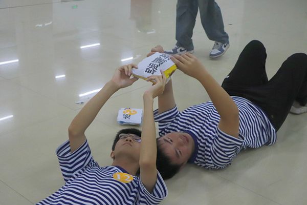 “风暴中的物资传递”环节,规则极具挑战性。各组队员头对头、脚对脚躺平,以手搭建“传送带”传递“物资”。随着指令下达,大家迅速就位,通过眼神与动作配合传递物资。过程中,有人体力不支晃动,队友立即调整姿势支撑;物资滑落时,就近队员迅速补救。现场气氛紧张热烈,智慧与协作在“风暴”中闪光。