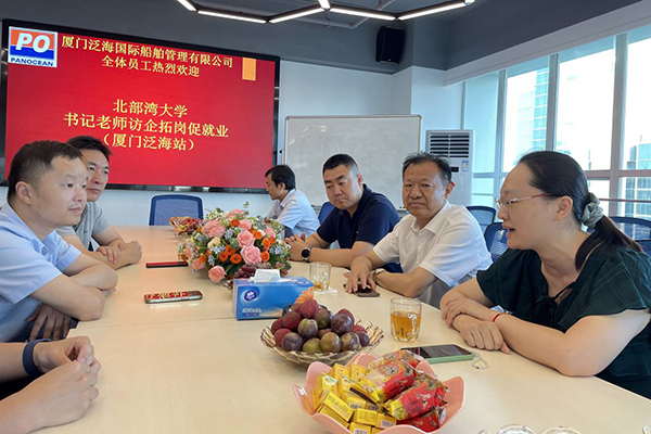 访企时,厦门泛海国际船舶管理有限公司、厦门海隆对外劳务合作有限公司、厦门华海佑船务有限公司负责人对我院领导老师的到来表示欢迎,介绍了本单位的基本情况、企业文化、组织架构、招聘需求、船员招聘方式及船员培养机制、船员工作生活现状等,并对我院在企校友的发展概况做了简要介绍。三家企业相关负责人均表示,北部湾大学学生素质高表现好,感谢海运学院长期以来为企业输送了大量优质船员,表达了继续到学校开展招聘工作的强烈意愿。在交流探讨中,何宜蔚副书记就与企业共建实习实训基地,邀请企业导师进课堂开展职业生涯指导和就业指导,优化学生人才培养模式,提高学生人才培养质量以及贴近市场需求拓宽就业渠道等,与企业进行了深入交流探讨,并初步达成了相关的合作意向。