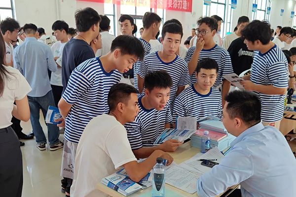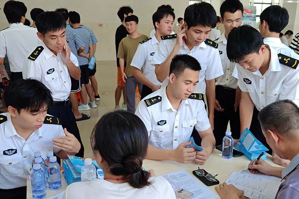 双选会现场,每家企业摊位前都挤满了应聘的毕业生,企业代表大方热情的介绍企业的相关情况和招聘要求,毕业生详细了解每个工作岗位的技能要求,基本工资,跑船周期等相关信息。