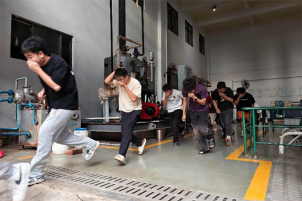 随后进入实战演练,模拟船舶配电屏起火后,师生迅速分组行动:切断电源、疏散人群、使用二氧化碳灭火器灭火、引导人员低姿疏散,全程仅用2分15秒,灭火准确率 100%。演习后蓝广林主任点评称,演练流程贴合海上应急核心需求,平时在生活中也要熟悉并掌握火灾报警和消防程序。